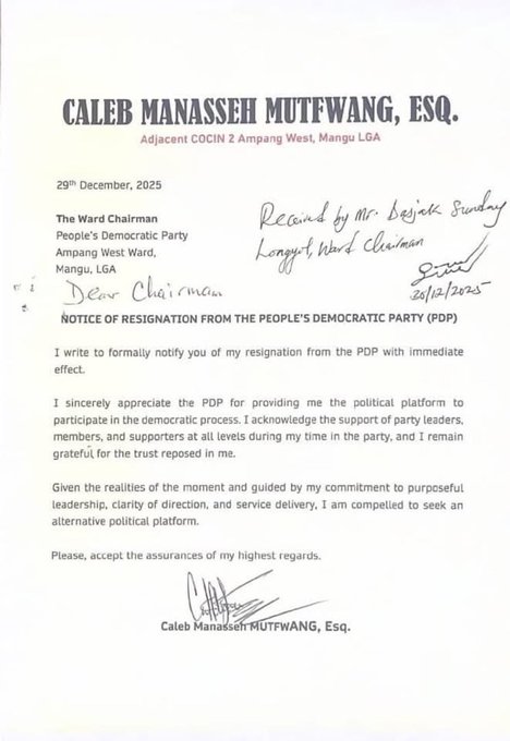 In a resignation letter dated December 29, 2025, addressed to the PDP Chairman of Ampang West Ward, Dasjak Sunday Longyol, Mutfwang explained that his decision was driven by the need to find an alternative political platform that would enable him to deliver purposeful leadership, clarity of direction, and improved service to the people of Plateau State.